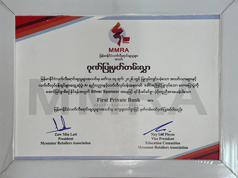 (𝟭𝟰.𝟯.𝟮𝟬𝟮𝟲) နေ့က 𝗖𝗵𝗮𝘁𝗿𝗶𝘂𝗺 𝗛𝗼𝘁𝗲𝗹 ၌ 𝗠𝘆𝗮𝗻𝗺𝗮𝗿 𝗥𝗲𝘁𝗮𝗶𝗹𝗲𝗿𝘀 𝗔𝘀𝘀𝗼𝗰𝗶𝗮𝘁𝗶𝗼𝗻 (𝗠𝗠𝗥𝗔) မှ ကြီးမှူးကျင်းပသည့် 𝗡𝗲𝘁𝘄𝗼𝗿𝗸𝗶𝗻𝗴 𝗦𝗲𝗺𝗶𝗻𝗮𝗿 တွင် 𝗙𝗶𝗿𝘀𝘁 𝗣𝗿𝗶𝘃𝗮𝘁𝗲 𝗕𝗮𝗻𝗸 (𝗙𝗣𝗕) မှ 𝗦𝗶𝗹𝘃𝗲𝗿 𝗦𝗽𝗼𝗻𝘀𝗼𝗿 အဖြစ် ဂုဏ်ယူစွာ ပါဝင်အားဖြည့်ခဲ့ပါသည်။ အဆိုပါအခမ်းအနားသို့ တက်ရောက်လာသူများအား 𝗙𝗣𝗕 ၏ 𝗦𝗼𝗰𝗶𝗮𝗹 𝗠𝗲𝗱𝗶𝗮 𝗖𝗵𝗮𝗻𝗻𝗲𝗹 များနှင့် ချိတ်ဆက်ပေးခဲ့ပြီး၊ ဘဏ်မှ ဝန်ဆောင်မှုပေးလျက်ရှိသော 𝗟𝗼𝗮𝗻 𝗣𝗿𝗼𝗱𝘂𝗰𝘁𝘀 များနှင့် 𝗗𝗲𝗽𝗼𝘀𝗶𝘁 𝗣𝗿𝗼𝗱𝘂𝗰𝘁𝘀 များအကြောင်းကိုလည်း အသေးစိတ် ရှင်းလင်းမိတ်ဆက်ပေးခဲ့ပါသည်။